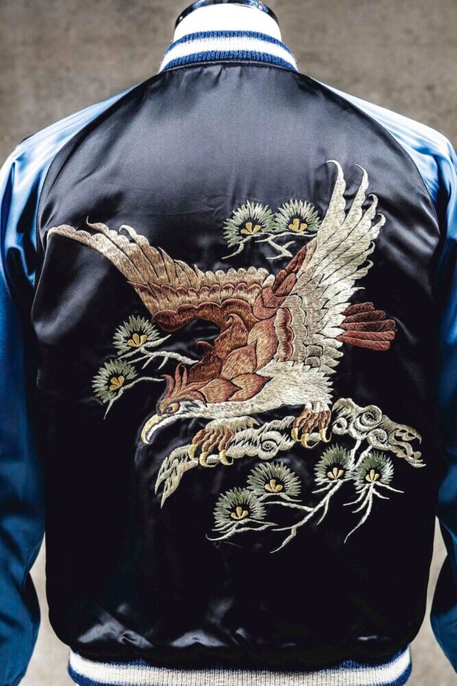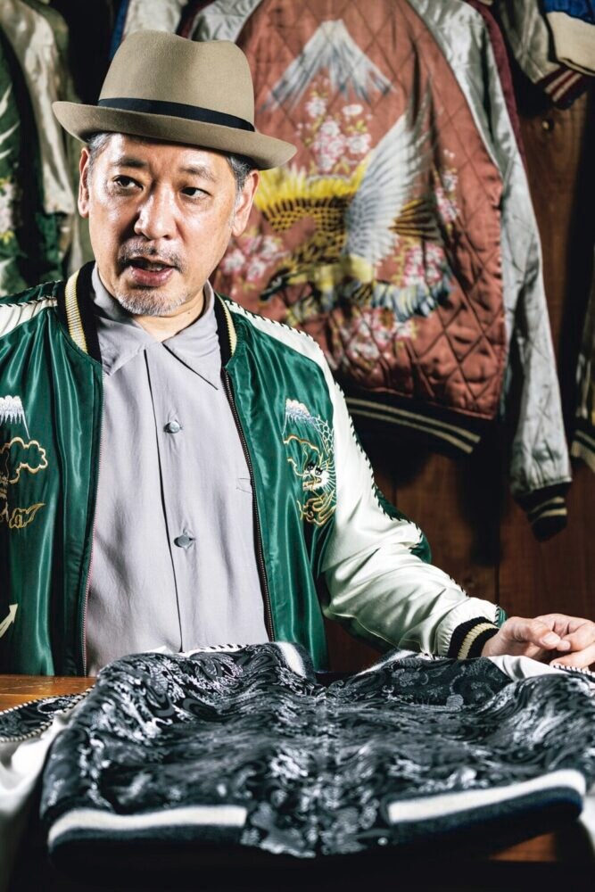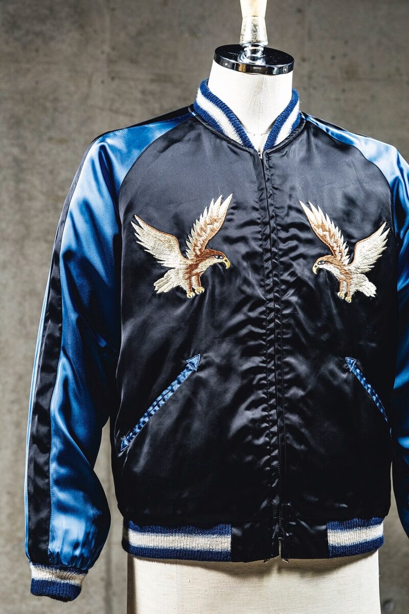 「無地の身頃に刺繍で柄を表現したものが通常のスカジャンなのに対して、織りで柄を入れたブロケード生地のスカジャンはヴィンテージ市場では滅多にお目にかかれないレア度を誇っています。ブロケードは米兵がスーベニアとして買っていくスモーキングジャケットなどにも使われていましたが、スカジャンに起用されるのは本当に珍しいことだったようです。さらにそのなかでも黒地がベースのブロケードは、激レア度MAXといえるでしょう」