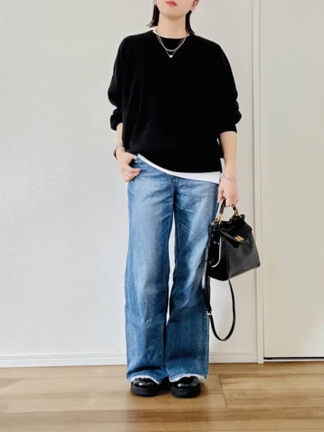 ニット×デニムの王道スタイルは、気を抜くと生活感が出やすい組み合わせ。そこで効果的なのが、首元や裾から白をのぞかせるレイヤードです。