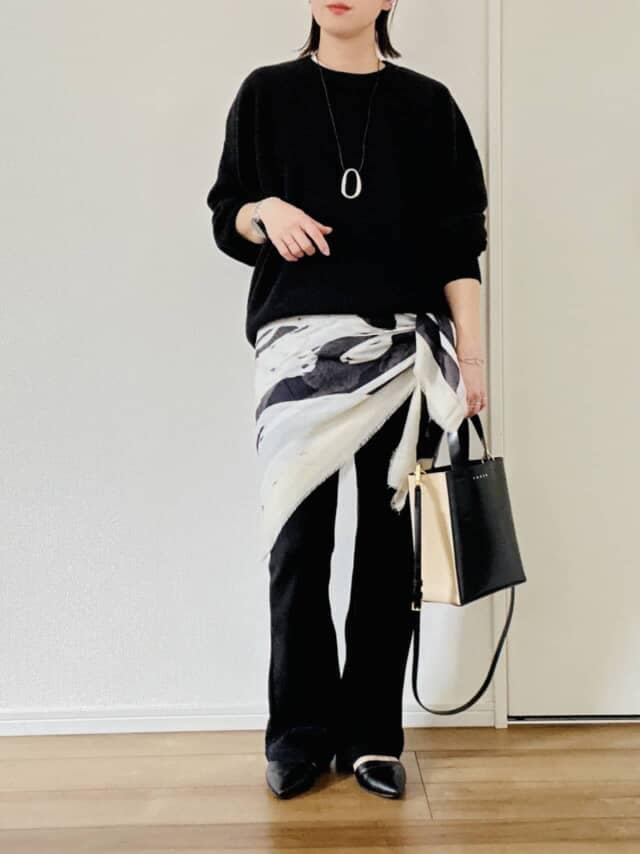 シンプルなニットこそ、小物で個性を出すのが正解。ロングネックレスで縦ラインを強調したり、腰まわりにスカーフを巻いて視線を分散させたりすることで、同じアイテムでもまったく違う表情になります。小物が主役になることで、ニットがぐっと洗練された印象に変わります。