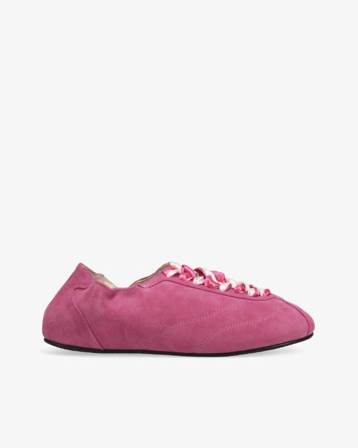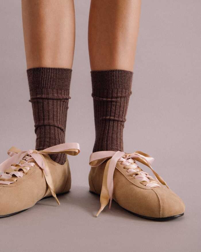 チュチュのように波打つギャザー仕様の履き口や、バレエシューズを思わせる艶やかなダブルサテンのシューレースが、上品な印象を演出します。