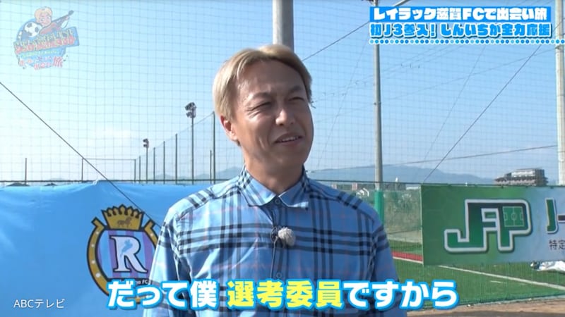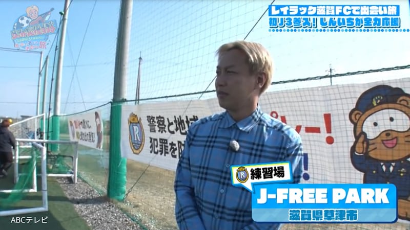 しんいちがやってきたのは、今シーズンからJ3に参入するレイラック滋賀FC。半年間、公式の選考委員を務めることになったしんいちは、いつにも増して超真剣な表情だ。選考委員として、ふいにある“監禁ロケ”などで物理的に無理な場合以外は、できるだけ試合をチェックしているとか。