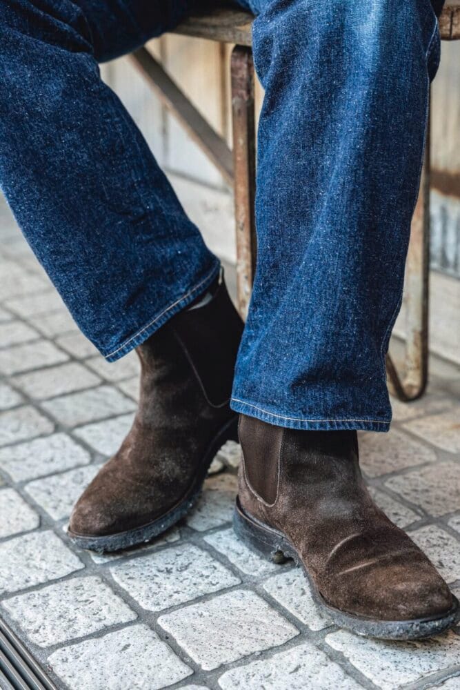 「普段はラギッドなアイテムを着ているので、スウェードは小物で取り入れることが多いです。今回は、ベージュのエンジニアブーツやウエスタンブーツでアメカジの王道を行くのではなく、ダークブラウンのブーツを合わせて大人の落ち着きを出せたらなと」。端正なフォルムとスウェードの柔らかさの融合にダークブラウンの深みが重なり、足元から装い全体を洗練させている。「どこかで捻りを効かせたスタイルを意識しています。重ねた年齢に相応しい工夫が必要だなと感じますね」。思わず引き込まれる品格を放ち、コーディネイトの完成度を大きく左右する力を秘めたスウェードには、大人の選択を叶えてくれる頼もしさがある。