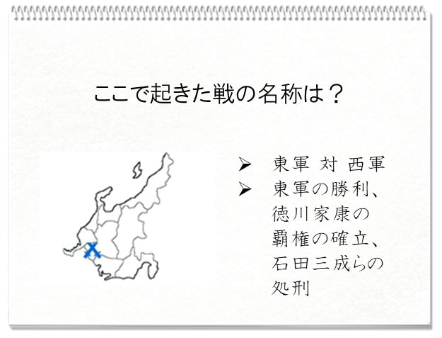 この問題は大サービスの初心者レベルの難易度。歴史に興味のない人でも聞いたことのある有名な合戦。小説やドラマ、映画の題材にも取り上げれれています。この戦は全国各地の複数の戦闘からなっていますが、歴史の趨勢を決した大規模な戦いがここで行われました。