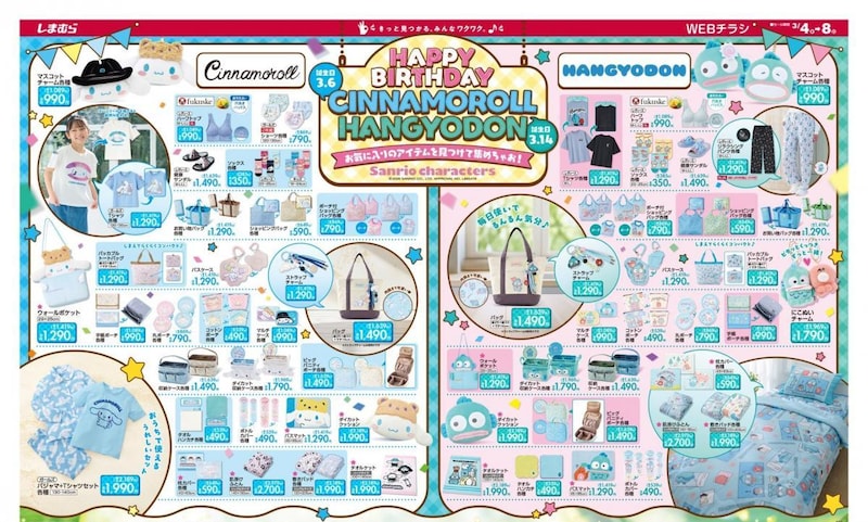 3月6日が誕生日の「シナモロール」と、14日が誕生日の「ハンギョドン」のグッズが多数登場しています。
