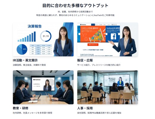 ・多言語広報:ジェネリックアバターが英語や中国語を流暢に話すことで、海外投資家向けの発信を即座に自動化。