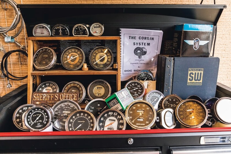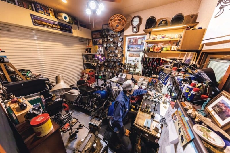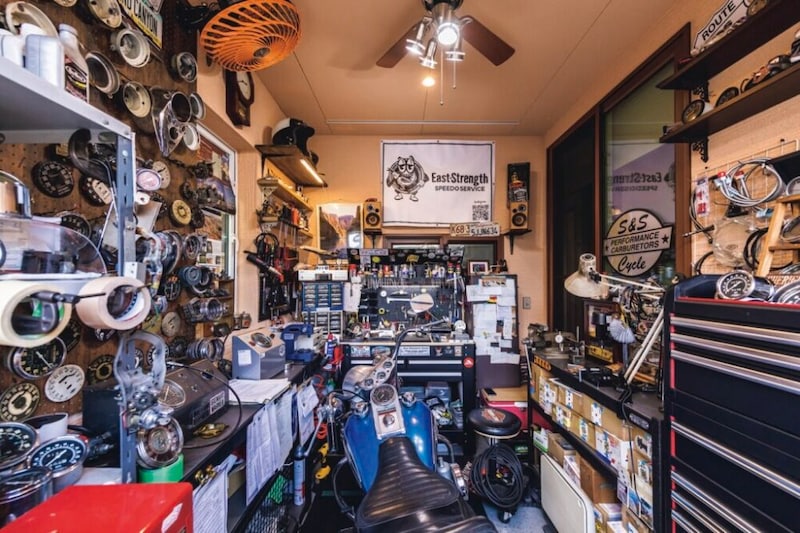 中村さんはハーレーのメーター修理を専門に行う「East Strength」として人気の存在。現在ガレージは工房としての役割が徐々に大きくなっており、日々修理を行なっている。