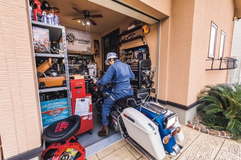 めちゃめちゃ天気が良い絶好のツーリング日和だけど、あえて今日は走らずに愛車と共に過ごす。そんな日があってもいいじゃないか。ハーレーの楽しみ方は何も走るだけではない。気になるところをイジってみたり、日がな一日眺めたり。それだけでも十分楽しい。それがハーレー。そんなハーレーライフを送るのに最適なのがガレージだ。ただし、ガレージを100%満喫するのには、ハーレー乗りそれぞれのこだわりやアイデアが必要。そこで、自分だけのこだわりの空間を作り上げた、先輩たちのガレージにお邪魔した。今回紹介するのは、10年前に自宅を建てた際に憧れのビルトインガレージを作ったという愛知県在住の中村智範さんだ。