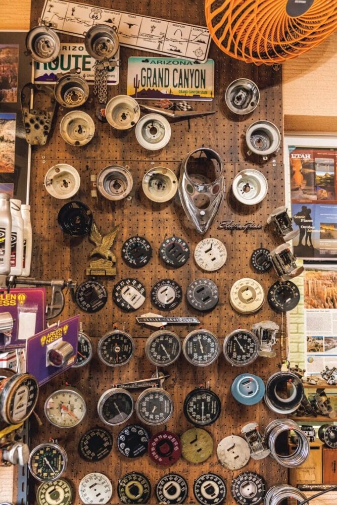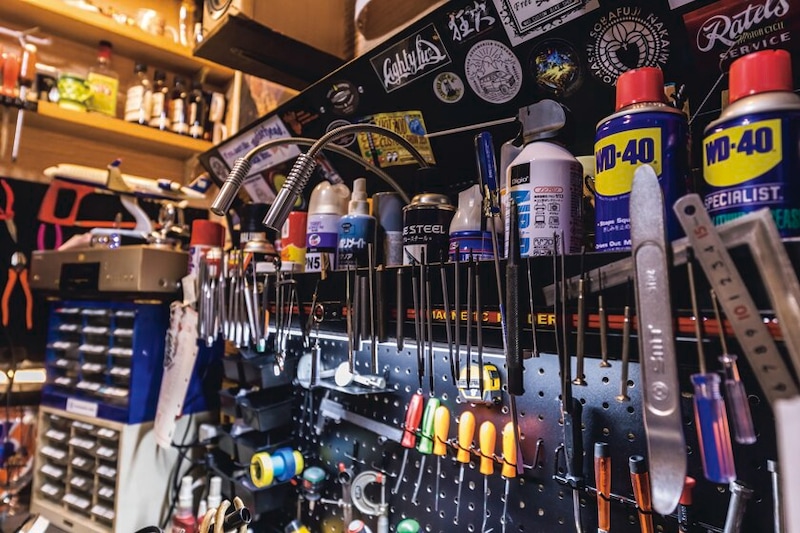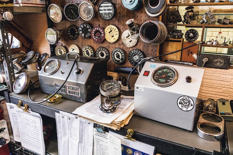 ガレージ壁面には所狭しとメーター修理に使用する工具やメーターパネルなどのパーツなどが並ぶ。
