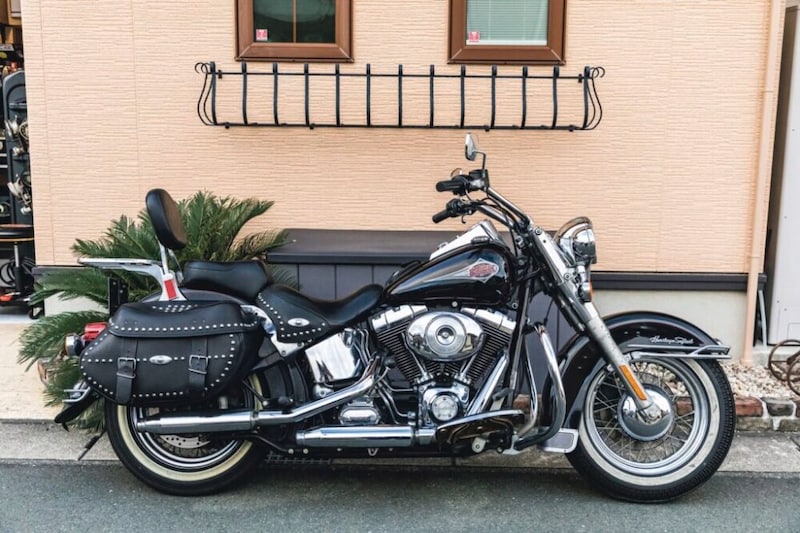 2002 FLSTC|オリジナルのヘリテイジクラシックは、地元のパパ友のお父さんがかつて乗っていたもので、もう乗らないからと譲り受けたもの。2002年式でキャブレター車というのが気に入っているそう。