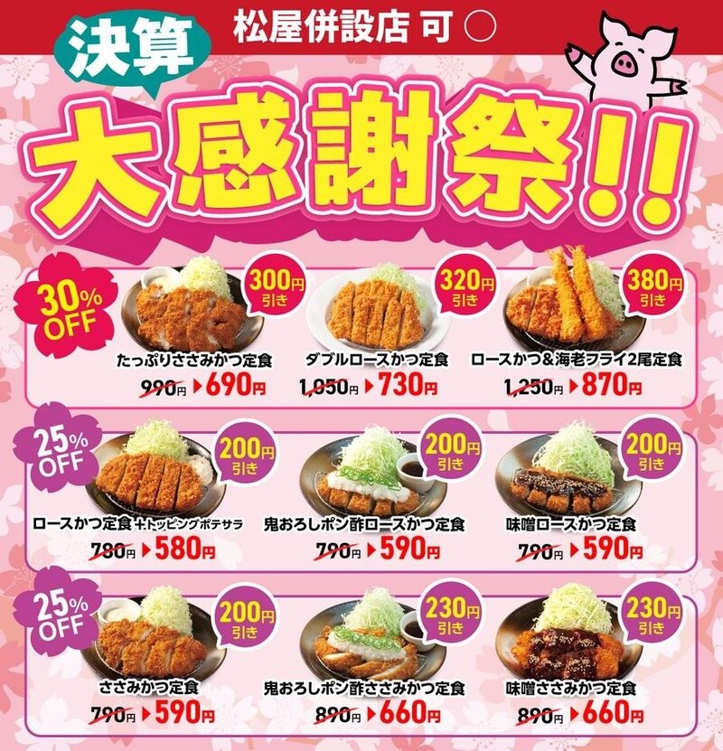 とんかつ専門店「松のや」の公式XアカウントX(@matsu_noya)は「決算大感謝祭!!」と題して、2026年3月4日15時から店舗で使える割引クーポンを配布中です。