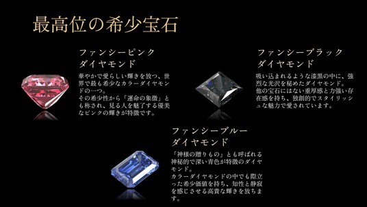 カラーダイヤモンドの中でも際立った希少価値を持ち、知性と静寂を感じさせる高貴な輝きを放ちます。
