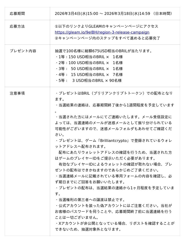 抽選で100名様に総額675USD相当のBRILが当たるキャンペーンとなっています。