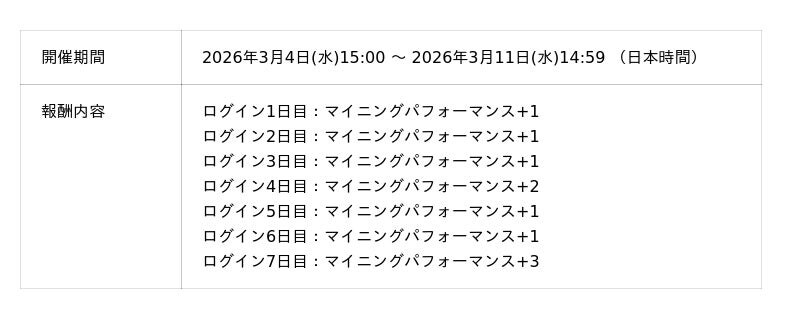 期間中、ゲームへのログイン日数に応じて「マイニングパフォーマンス」のレベルアップを報酬としてプレゼントいたします。