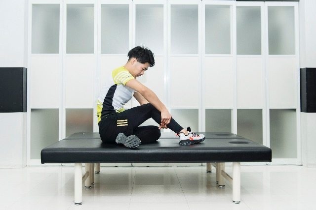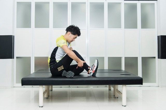 (3)両手で指圧しながら、足首を上下に10回動かす
