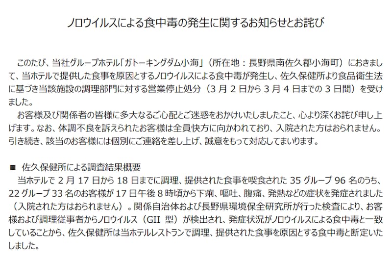 長野県は、南佐久郡のホテルレストランを利用した33人が、食中毒症状を訴えたと公表。
