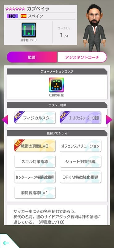 該当の選手を編成すると強くなるフォーメーションコンボ「壮麗の巨星」と、戦術得意度Lv10を持つ新★6監督「カプベイラ」が登場!