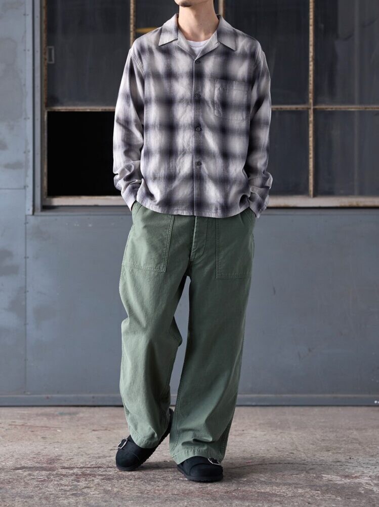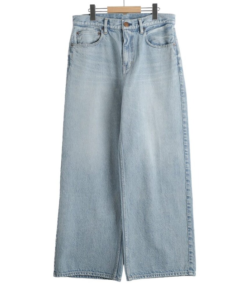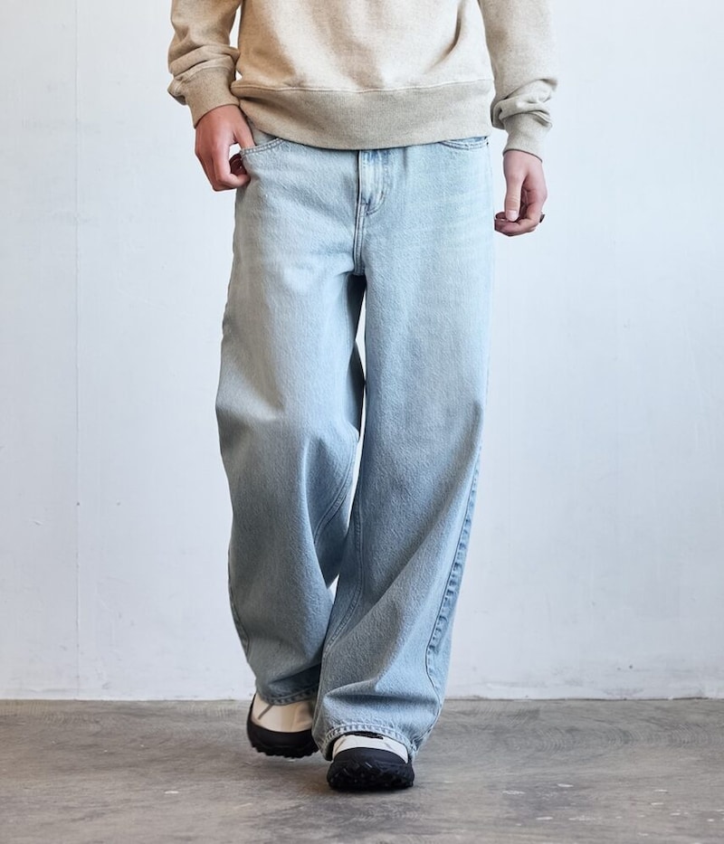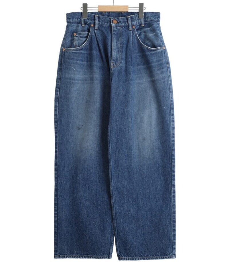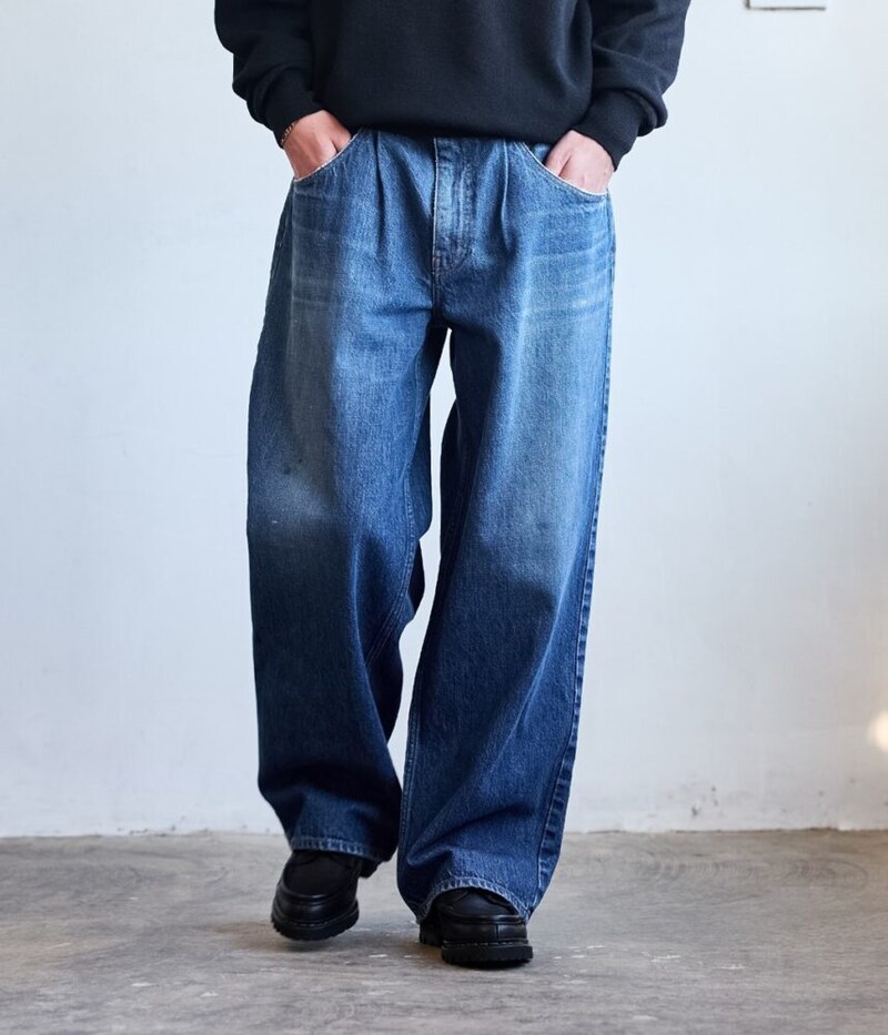 裾幅を再調整することで、ワイドながらもストレートに見える洗練されたシルエットを追求している。ヴィンテージライクなペイント&汚し加工を施し、リアルな経年変化を再現した。