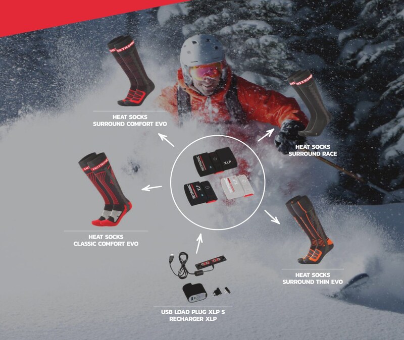 電熱ソックスの「XLP S」シリーズは、用途やフィット感の好みに合わせて選べる3タイプをラインナップ。快適性を重視した「Comfort」、ブーツ内でかさばらない薄さと保温性のバランスを追求した「Thin」、そしてレースシーンを想定し、薄手ながら暖かさと快適性を両立しつつ雪面感覚を的確に捉えられるよう最適化された「Race」が用意されている。