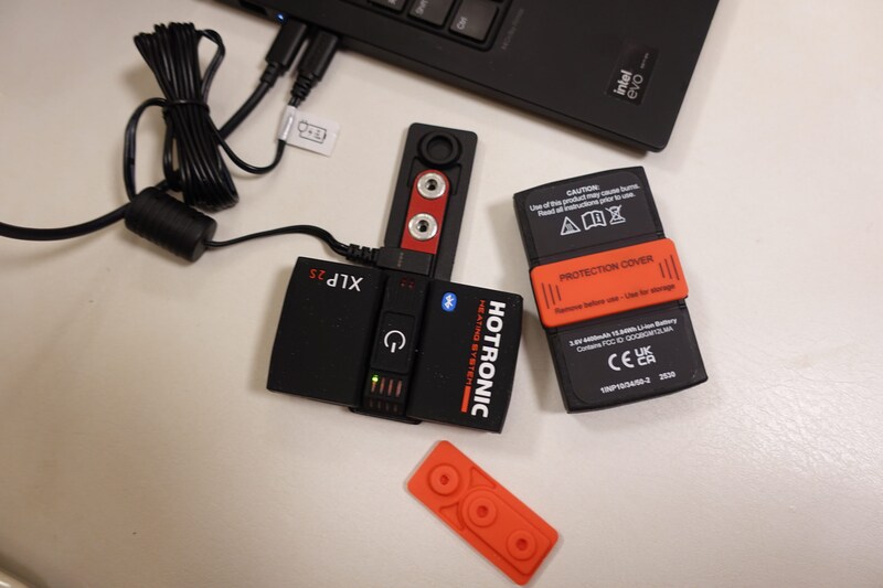使用前に、まずは充電。バッテリーの赤いカバーを外し、USB-C端子付きの充電ケーブルをスナップ式コネクターで接続する。充電時間はおよそ5〜7時間。前日の夜に準備しておけば、就寝中に充電を完了できる。