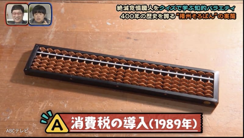 鰻が密着するのは、兵庫県小野市の特産品、400年の歴史を持つという「播州そろばん」を作る、老舗企業DAIICHI。5代目社長の宮永さん曰く、若い職人は育っているが、そろばんの需要が減っているため、絶滅の危機にあるという。「そろばんの需要が減った理由とは?」が第1問だ。