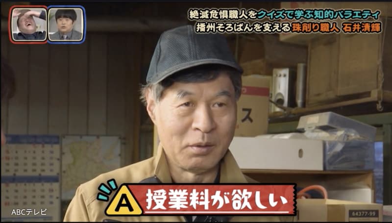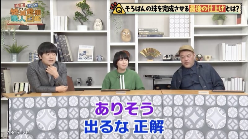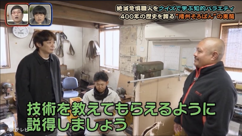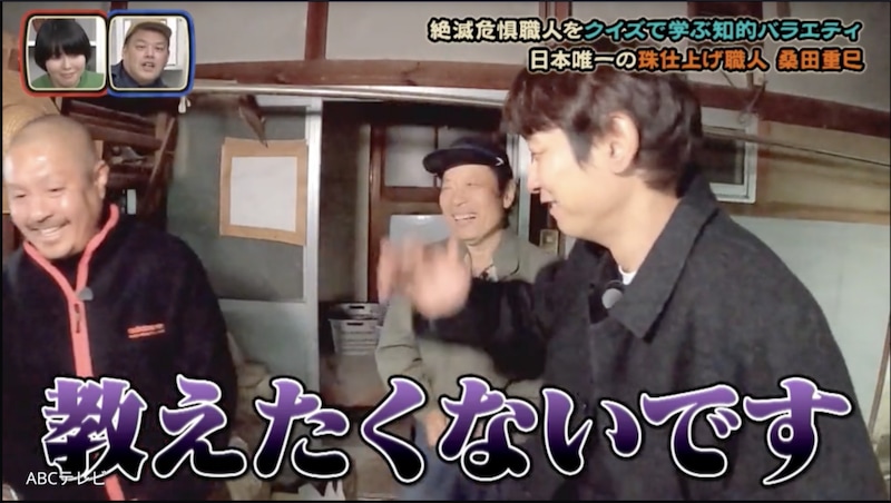 「珠仕上げ」の職人さんに「技術を教えてほしい」と頼み込む鰻。20分説得しても埒があかず、イライラしてしまった鰻が「教えたいのか、教えたくないのか、はっきりいきましょう!」と迫った結果、交渉決裂! 「竹ひご職人」に至っては、実は撮影すらNGだったとか。播州そろばんの未来が心配でたまらなくなる、リアルなルポルタージュの様子は、3月2日の「山里&バカリのクイズ!絶滅危惧職人図鑑」(ABCテレビ)で放送された。TVerでも全4回が無料配信中。