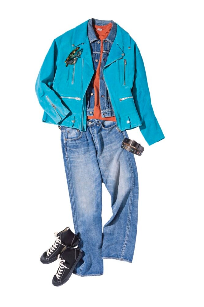「ここで言う難易度とは最初のハードルの話であって、着こなし自体は超カンタン。いつものアメカジ服、デニムのセットアップの上から羽織る。ちょっと乱暴ですが、これだけでOKです。押さえることがあるとしたら、体を横に三分割したときの頭・胴・足に同色アイテムを散らせば、よりまとまりが出ます。今回でいうサングラス・ベルト・スニーカーの黒ですね。あとは、せっかくカラースウェードを着るので、インナーも遊びのある色を選んじゃいましょう。ブルーに限らずどんな色でも、ジャケットの補色かつトーンの低い優しいカラーを入れると、アクセントになるし主役も際立ちます」