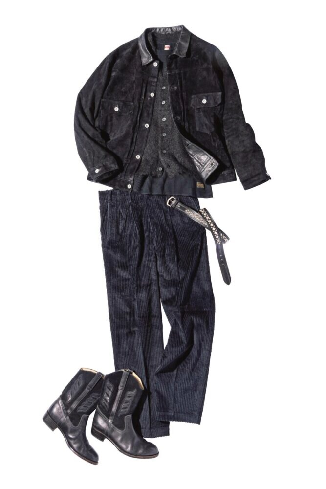 「人によっては高いハードルに感じるかもしれませんが、黒1色のスタイリングはごまかしが利きやすく、想像以上に簡単です。ただ、もっとカッコよくするため素材感に気を配っていて、ざっくり言うと毛並みのニュアンスを揃えています。パンツには、スウェードと同様に毛並みの流れで見え方が変わるコーデュロイを。インナーにはニットを入れたかったのですが、編み目があるとコーデュロイの邪魔になるので毛足の長いモヘアをチョイスしました。ここまでニュアンスのある素材で統一していれば、襟元やベルト、ブーツの表革がほどよいアクセントとして洒落感アップに繋がります」