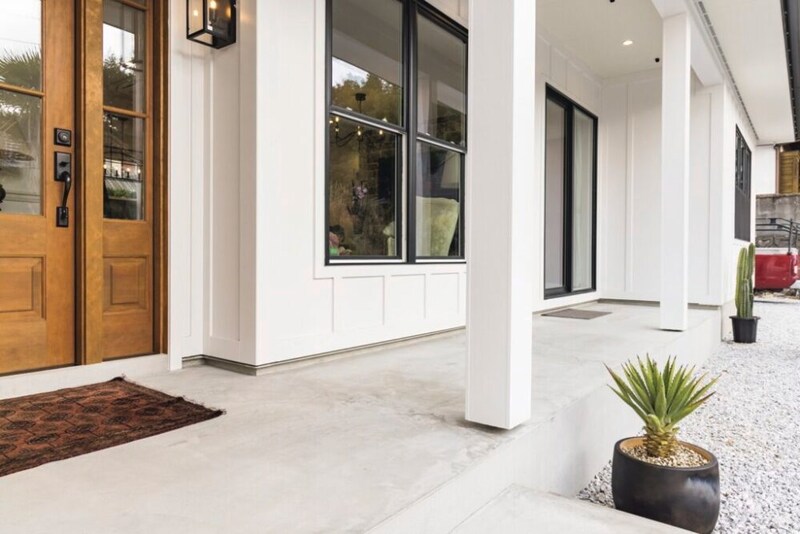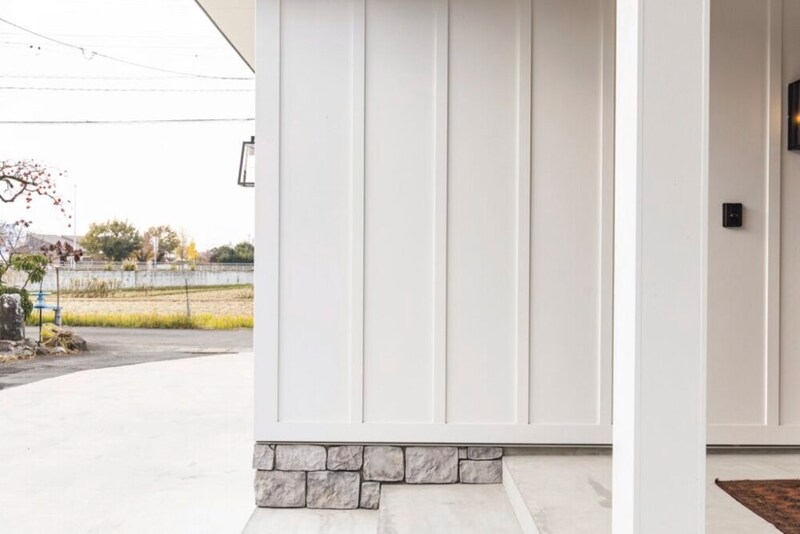 基礎の立ち上がり部分は石を積んだようなデザイン。外壁はアメリカの住宅を象徴する、縦に板を貼ったボード&バテンを採用して存在感のある外観に。