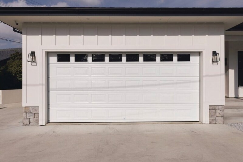 アメリカ車が2台余裕で入るガレージには大型の電動シャッターが付く。カラーは外壁に合わせてホワイトに。