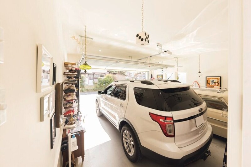 室内パントリーから見たガレージの内部。手前には奥様がメインで乗っているフォード・エクスプローラーが入っている。現状で少し余裕をもたせている壁側のスペースは今後野見山さんのバイクが入る予定だ。