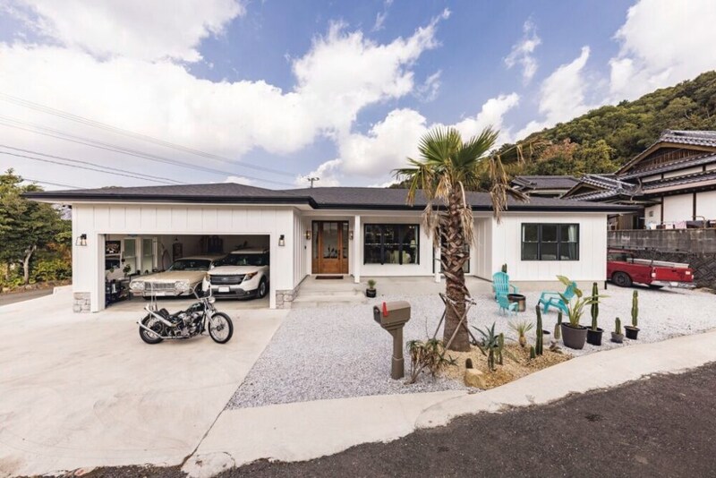 アメリカ西海岸に建っているかのような白壁の平屋住宅。ひと際存在感のあるガレージを備え、クルマやバイクとともに暮らすにはもってこいの家だ。この家はオーナーである野見山さんが憧れたスタイルをカタチにしている。