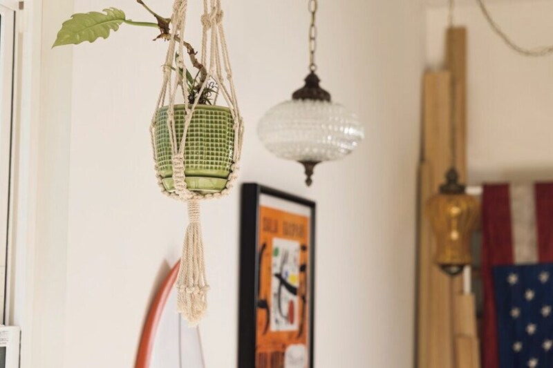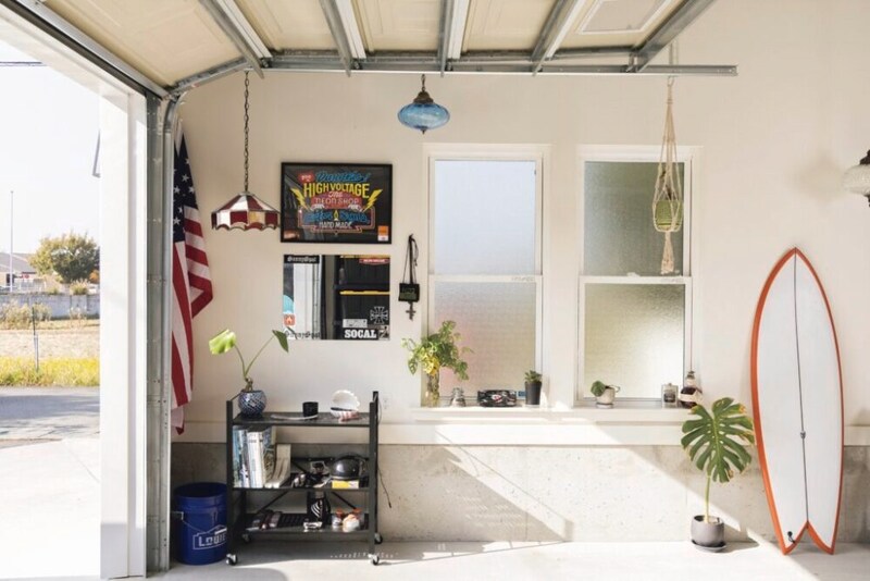 ガレージ内はシンプルながら、所どころにヴィンテージのランプや植物、サーフボード、星条旗などを飾ることで、ガレージ内のアクセントとしている。
