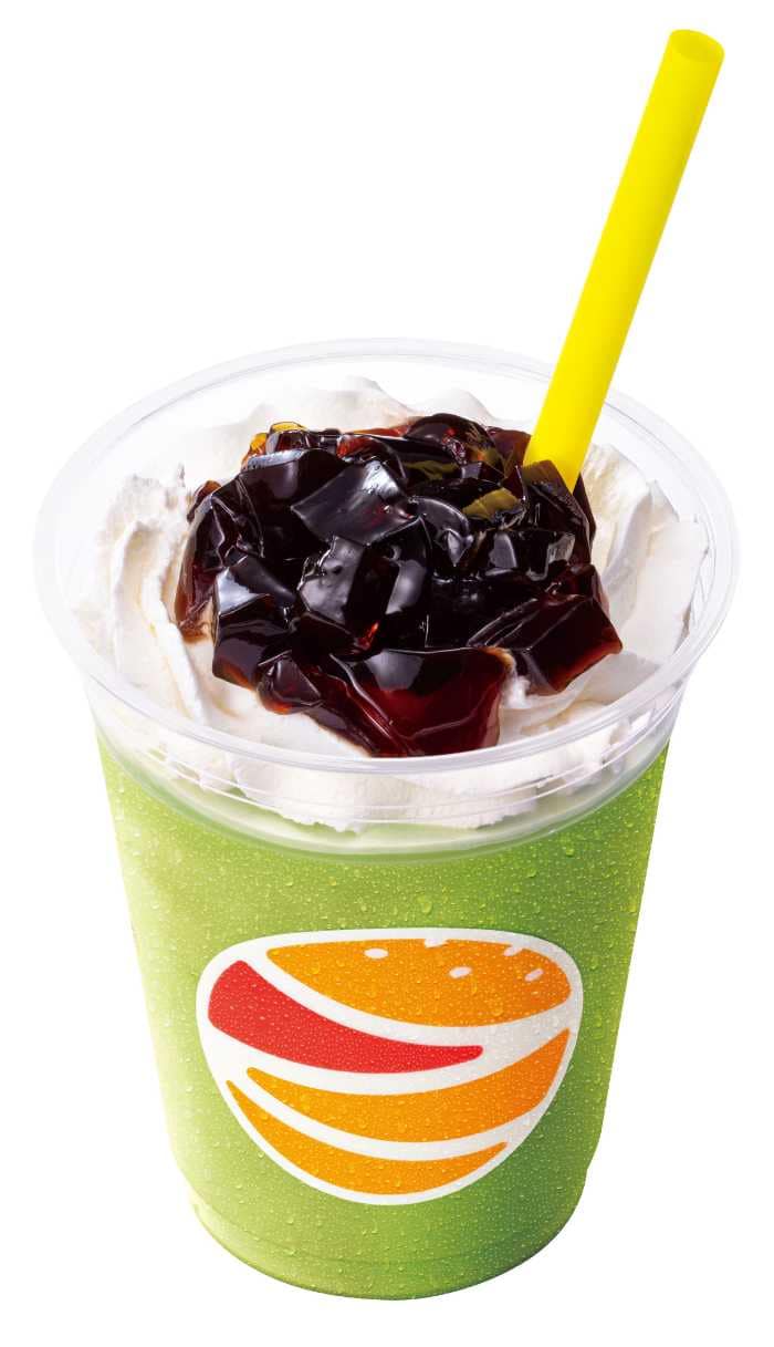 抹茶を使用したシェーキに、口どけの良いホイップクリームと沖縄県産黒糖を使用した黒糖ゼリーをトッピングした一品。抹茶のほろ苦さと黒糖のやさしい甘みが調和した和風シェーキです。ぷるんとした黒糖ゼリーがアクセントになり、最後まで飽きずに楽しめます。