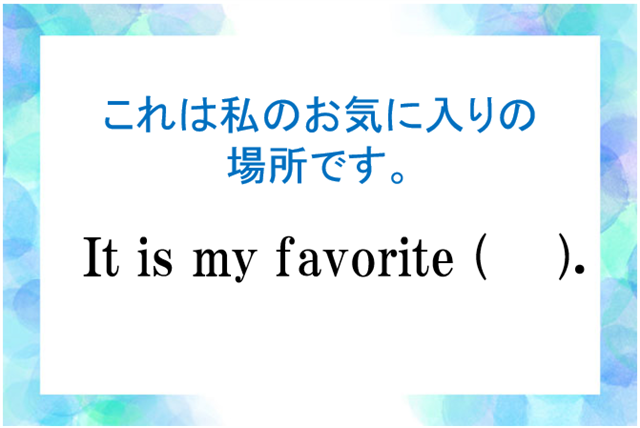 今回の問題では「お気に入りの場所」「お気に入りの映画」「お気に入りの音楽」など、自分の好みを伝えるときに欠かせない英会話をおさらい! ヒントは「It is my favorite~.」で「これは私のお気に入りの~です。」という意味になるので、カッコに入る英単語はというと……?