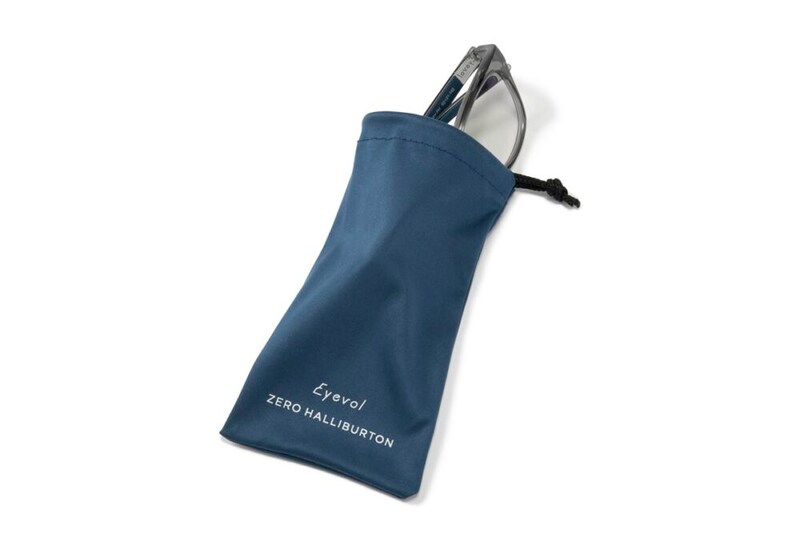 ラバーカラーと同じ〈ネイビー〉を用いた巾着袋が付属。通常は別売りケースに付属するメガネ拭きと同素材を採用し、巾着袋としてもメガネ拭きとしても使用できる。フロントにはダブルロゴを配置した。