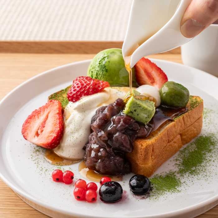 ブリオッシュトーストにアイスクリームや小豆、白玉、フルーツなどを贅沢に盛り合わせ、玉露バターとともに楽しめる華やかな一皿です。