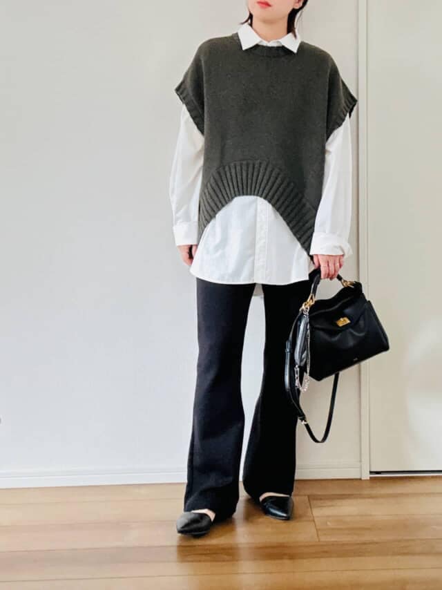 端境期に選ぶなら、デザインにひとクセある1枚が便利。ZARAのアシンメトリーヘムのニットベストは、裾の斜めラインが自然と視線を流し、気になるお腹やウエスト周りをすっきり見せてくれます。