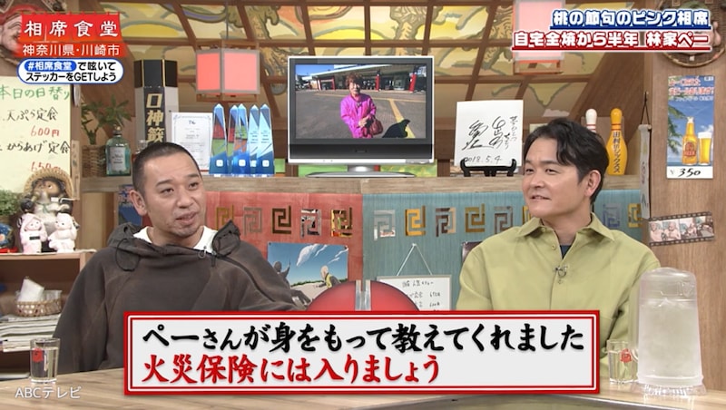 ⾃宅マンションが⽕事で全焼した84歳タレント・林家ぺーが、バラエティ番組『相席食堂』(ABCテレビ)に登場! 妻のパー⼦は家に置き、今回は珍しく1人で厄払いロケに挑んだぺーは、まさかの“自虐火事ダジャレ”を連発し、予想外の“オチ”を迎え……!?