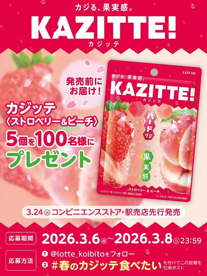抽選で100名に「カジッテ〈ストロベリー&ピーチ〉」5個セットがプレゼントされます。