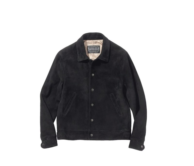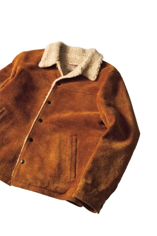 19世紀半ば頃に牧場での作業時に着られていたアウターである、ランチコートがベース。防寒用であったことから着丈が長く、ライニングにはウール100%のボアを備える。革本来の表情としなやかさを保ったまま染色することのできる水染めの技法を使い、カウボーイが着用していた当時の質感を思わせる粗野なスウェードの風合いと、柔らかな着心地を両立する。全体の雰囲気に対し、直線的なヨークや黒のボタンなど、ディテールはシャープな印象だ。