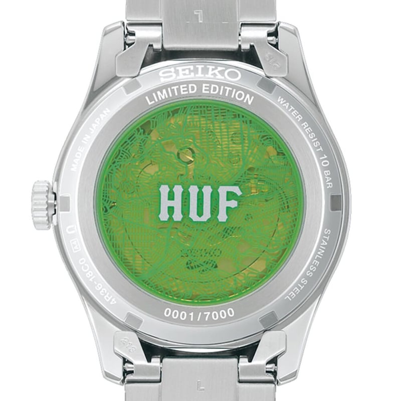 シースルーバック仕様の裏ぶたは、ダイヤルと同じく「HUFグリーン」を採用し、サンフランシスコのシティパターンの線画をあしらった。数量限定モデルの証として「LIMITED EDITION」とシリアルナンバーが刻まれている。