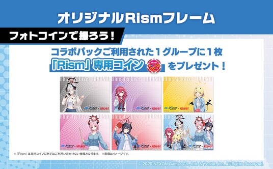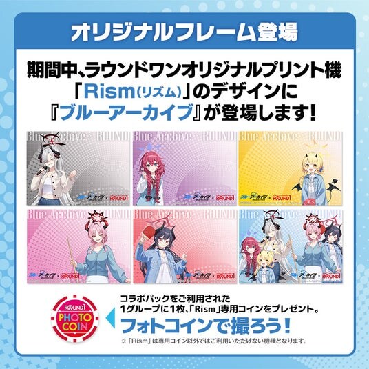 さらに、ROUND1のオリジナルフォトプリント機「Rism(リズム)」にて、『ブルーアーカイブ』のフレームで撮影ができる専用コインを1グループにつき1枚プレゼントいたします。