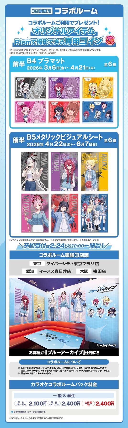 コラボルームのご利用で、前半【B4プラマット(全6種)】、後半【B5メタリックビジュアルシート(全6種)】をランダムでプレゼントいたします。