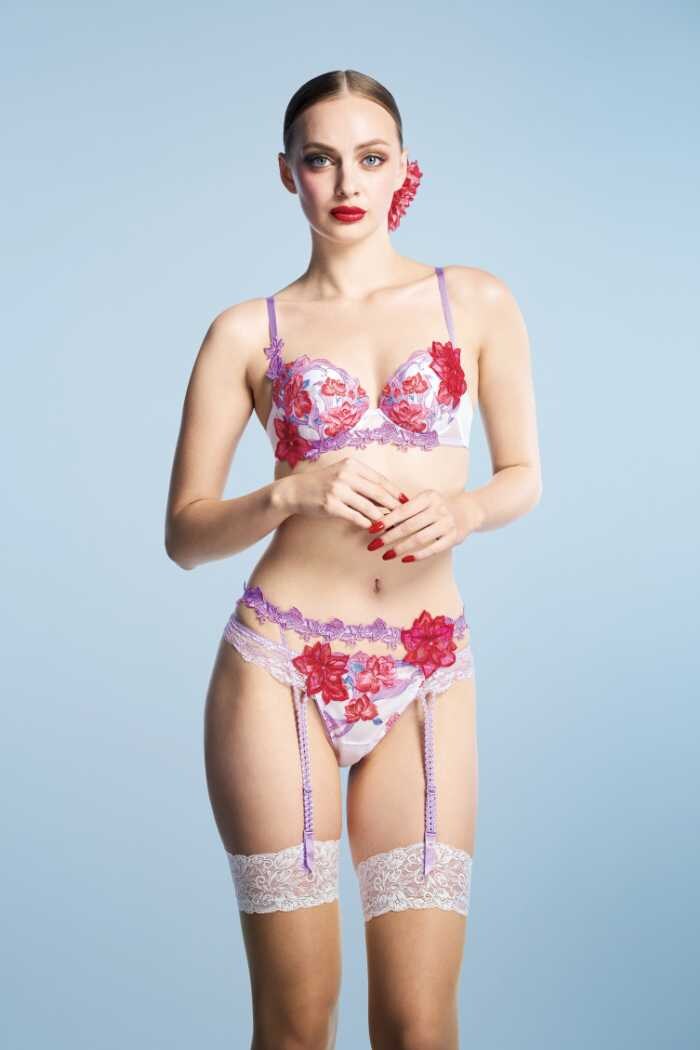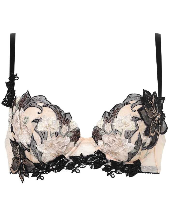 バストボリュームを脇から中央に寄せ、美しい谷間をメイクするサルート定番ブラジャー。クレマチスの花をイメージした存在感のあるアップリケと刺繍レースが華やかさを演出します。