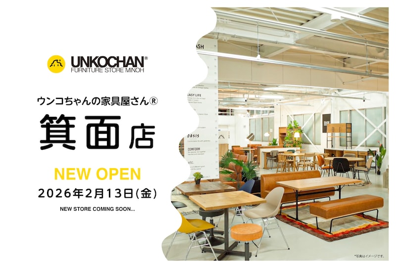 「ウンコちゃんの家具屋さん 箕面店」が2026年2月13日(金)にオープン! 北摂エリア最大級となる新店舗の見どころをご紹介します。