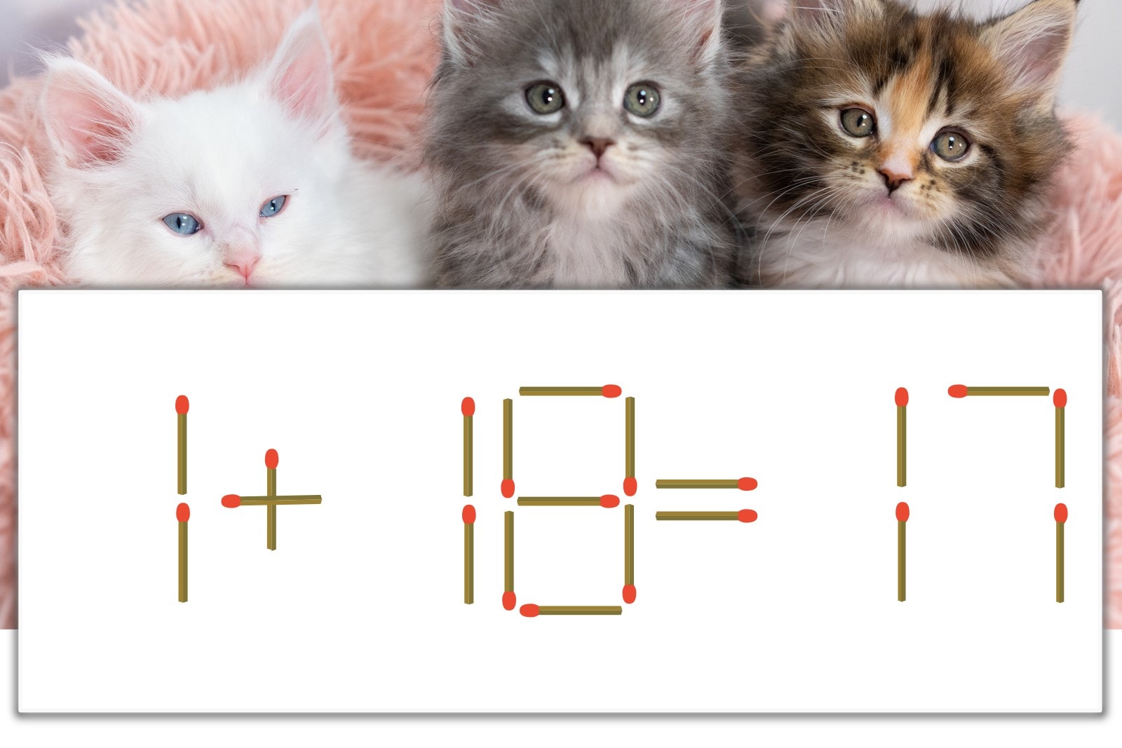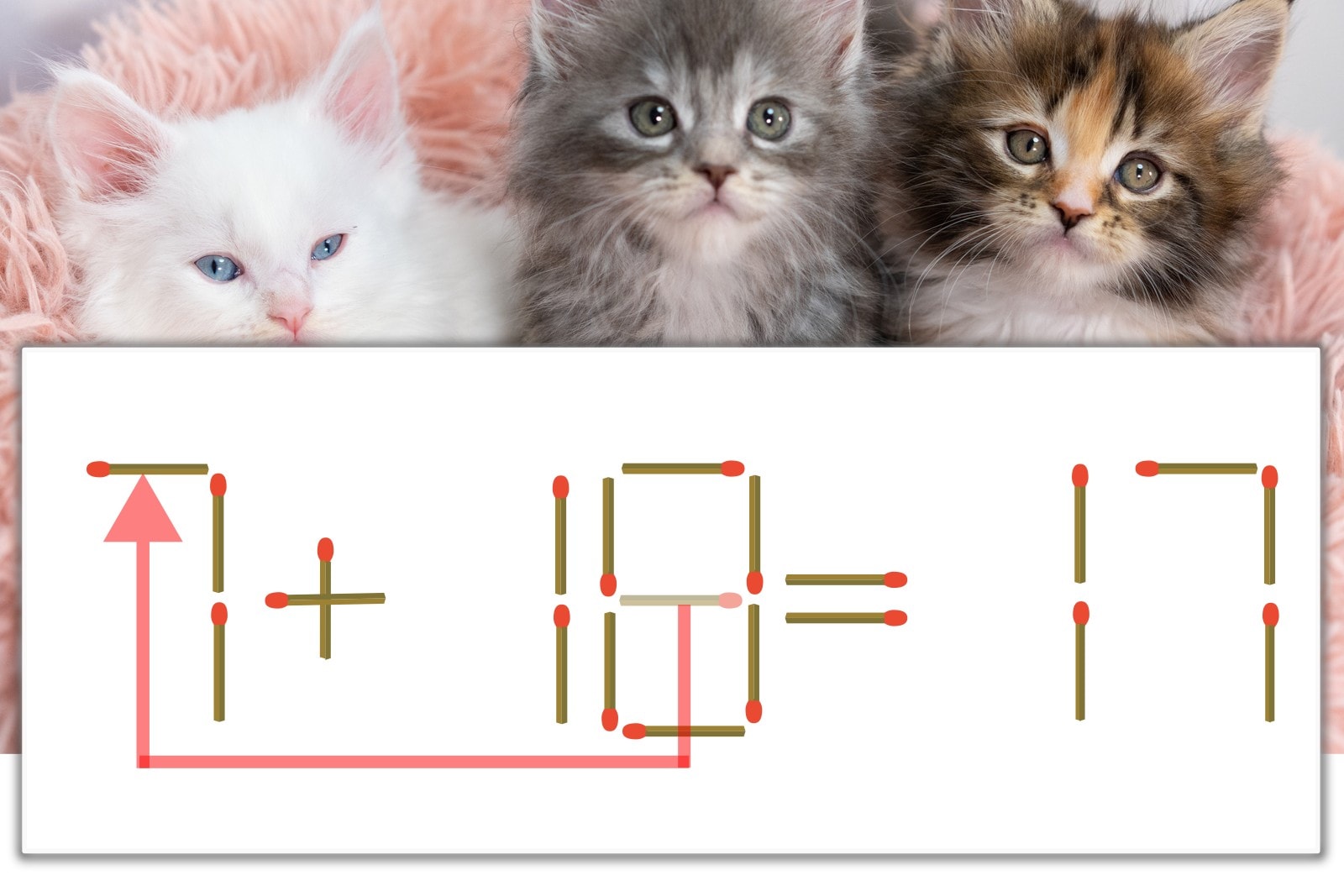 「8」を別の数字に変化させると答えが導き出せます。「8」のマッチ棒を1本移動して、「1」を「7」にしてみましょう。すると、「7+10=17」が成立します。