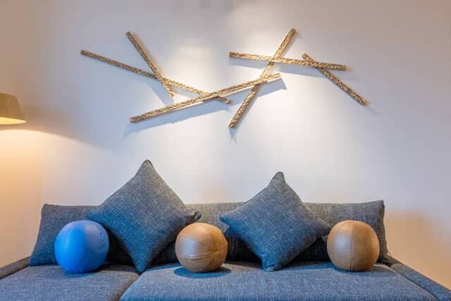 ソファー背後の壁には稲藁とアルミを組み合わせたアートが架かります。兜町には金融世界を動かした歴史的建造物の間にカフェやギャラリー、醸造所など、新旧の小さな商いが芽吹き、小鳥が小枝などの断片を集めて “巣” を作るように人々が集います。歴史と現在、自然と都市が交差して、新たな創造を生み出す兜町を表現しています。
