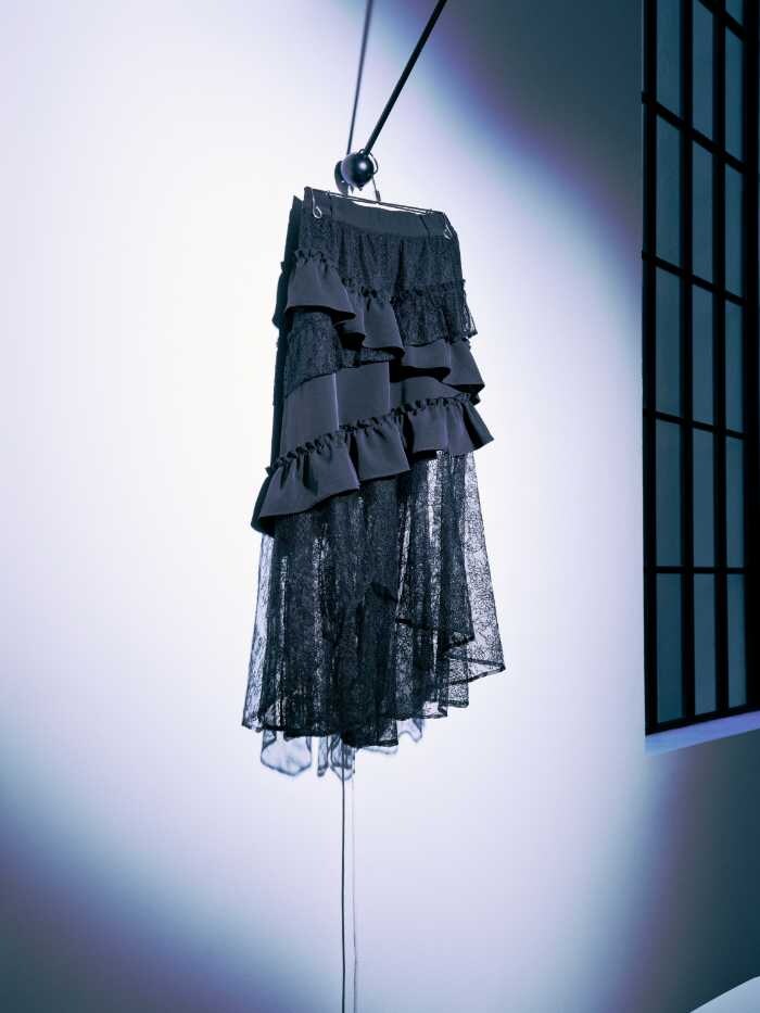 レースとフリルの多重レイヤードが美しいスカート。裾の透け感あるレースが軽やかで、パンツとのレイヤードコーデにもおすすめです。