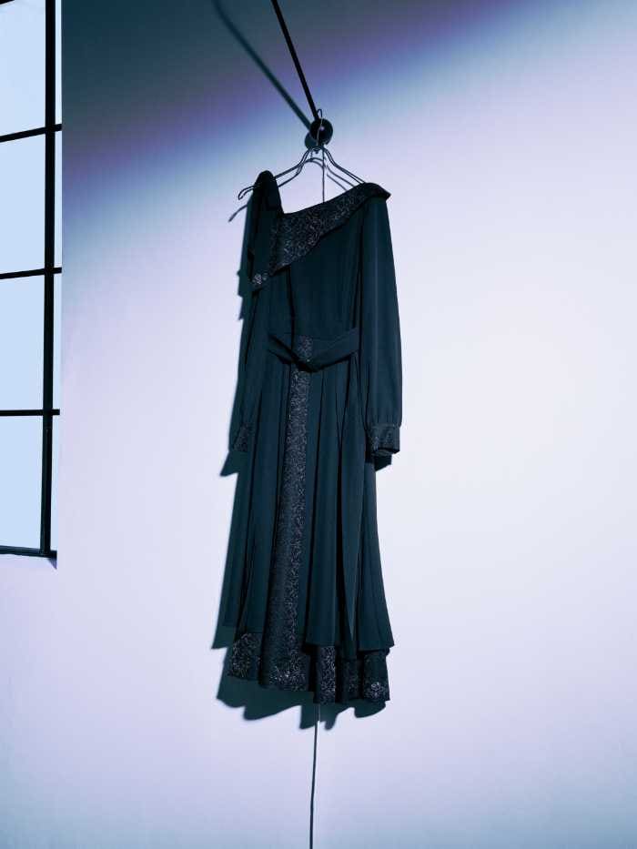 ジャガード×プリーツデザインのワンピースに、刺繍入りスカーフが付属。首に巻いたり肩紐に通したりと、アレンジを楽しめる一着です。