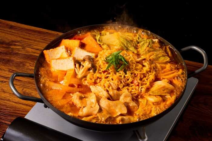 「辛ラーメンで作る コリコレ プデチゲ」は、韓国語で「部隊鍋」を意味し、ソーセージやランチョンミートを加えるのが定番。